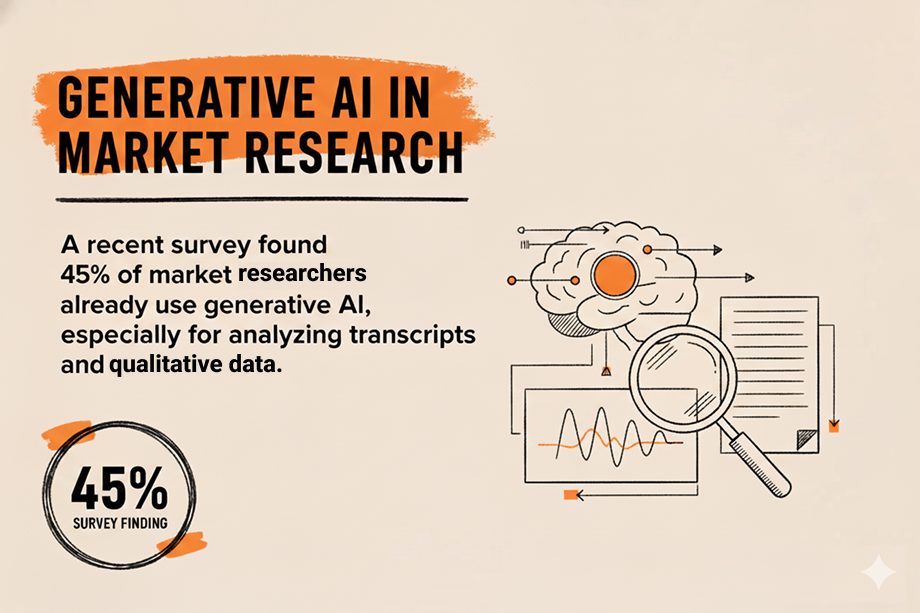 Qualitative research — in-depth interviews, focus groups, and so on — is one of the most predominant market research methods, but sorting through transcripts manually can be a slow, drawn-out process. AI-powered tools can automate the more tedious aspects of this work. It can transcribe IDI interviews and focus group recordings, extract themes, tag sentiment or categorize data by applying codes to text. A recent survey found 45% of market researchers already use generative AI, especially for analyzing transcripts and data.