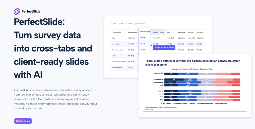 PerfectSlide from BTInsights is an all-in-one AI survey analysis tool that can help you quickly create cross-tab tables and generating client-ready slides in your exact format. PerfectSlide is, essentially, a survey analysis AI co-pilot that takes care of the most time-consuming steps automatically while you focus on interpreting the survey findings. Here’s why PerfectSlide is different:
