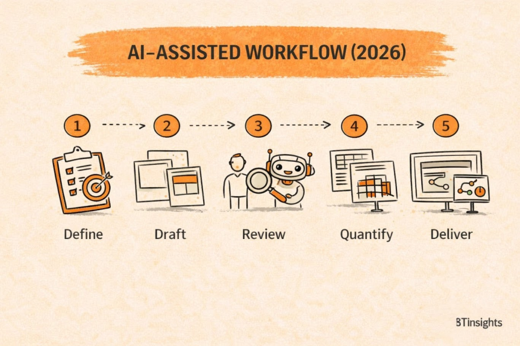 AI is making the “first draft” cheaper. That includes draft report outlines, draft insight statements, and an initial slide flow. The key is to treat AI as an accelerator, not an authority.